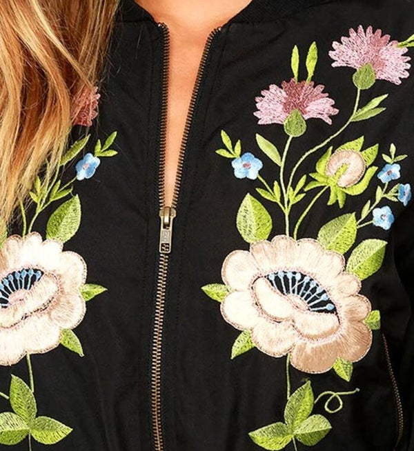 The Glamorous Horticulture Club Black Embroidered Bomber Jacket is perfect for the it-girl with a green thumb! Woven poly shapes this trendy bomber jacket with a ribbed neckline, cuffs, and hem, while pink, blue, yellow and green floral embroidery blooms across the bodice and sleeves. Brass zipper pockets and front closure.